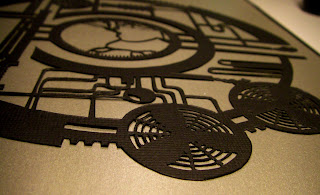 This is in heavy weight black paper. I'm not so happy, the thickness of the paper made it difficult to get the cut perfect, especially the curves. I am looking into using finer stock and upgrading my knife to a swivel blade.